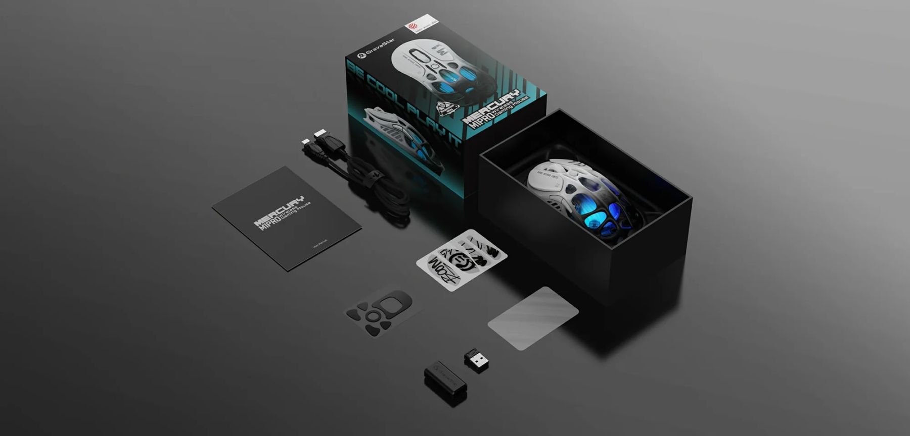 Комплектація:інструкція, зарядний кабель, миша, нековзні накладки, тефлонові накладки для ніжок, серветка для чищення, USB-A до USB-C подовжувач приймача, приймач 1k