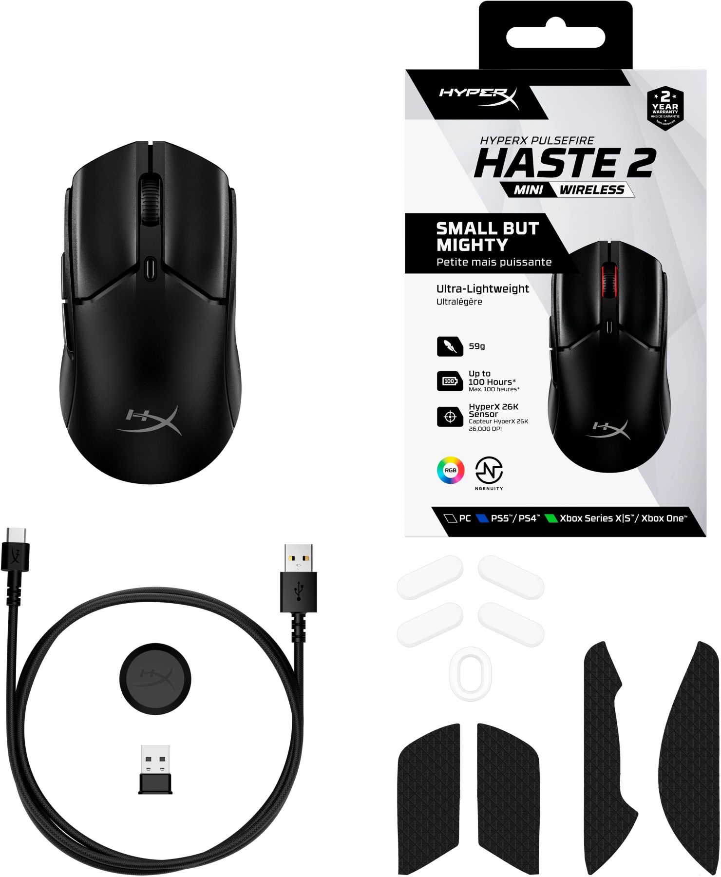 Комплектація:Бездротова гарнітура HyperX Pulsefire Haste 2 Mini, Маніпулятори HyperX, Ролики з низьким коефіцієнтом тертя, Кабель USB-C до USB-A, Бездротовий USB-ключ, USB-подовжувач, Короткий посібник користувача