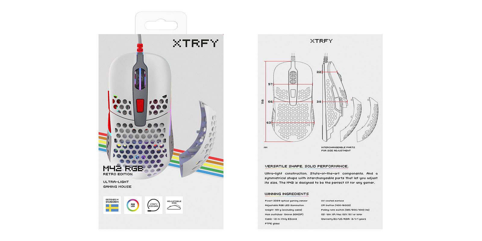 Надлегка конструкція. Сучасні компоненти. І симетрична форма зі змінними частинами, які дозволяють регулювати розмір миші. M42 ідеально підходить для будь-якого геймера.